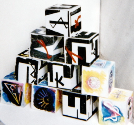cubus picto- 1985- scatole d'artista- cubo cm 10x10x10- acrilici su carta